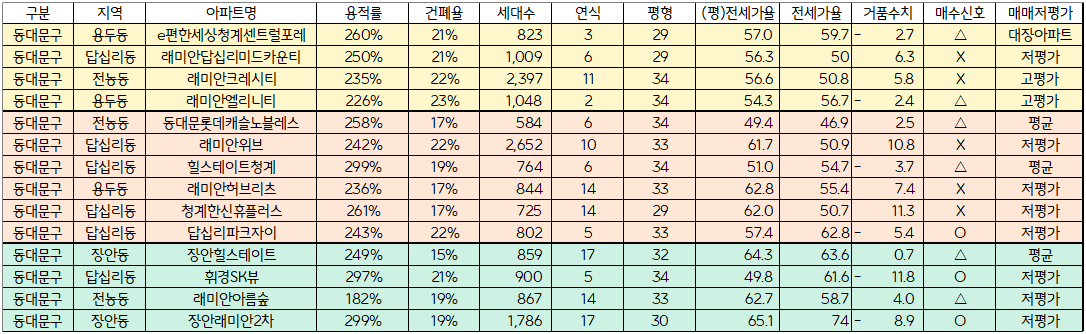 1. 동대문구 30% 이내 아파트의 현재 전세가율과 저평가아파트를 확인하겠습니다