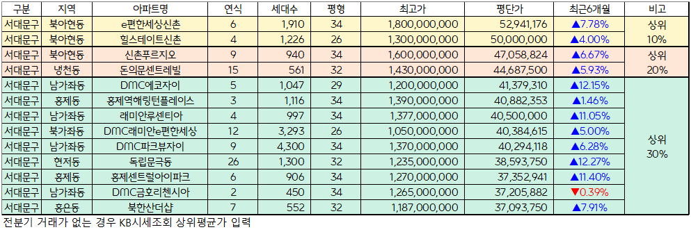 아파트실거래가(아실) 순위분석을 활용하여 아래 기준을 적용한 아파트 중 평단가가 가장 높은 e편한세상신촌을 기준으로 상위 30% 이내 아파트는 아래와 같습니다