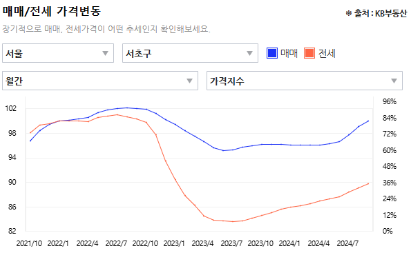 3분기 현재 서초구 전세지수는 23년 7월 이후 상승 / 매매지수는 23년 6월 이후 상승하는 모습입니다