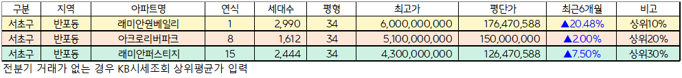 아파트실거래가(아실) 순위분석을 활용하여 아래 기준을 적용한 아파트 중 평단가가 가장 높은 래미안원베일리를 기준으로 상위 30% 이내 아파트는 아래와 같습니다