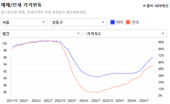 3분기 현재 성동구 전세지수는 23년 7월 이후 상승 / 매매지수는 23년 7월 이후 상승하는 모습입니다
