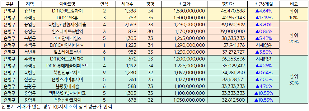 아파트실거래가(아실) 순위분석을 활용하여 아래 기준을 적용한 아파트 중 평단가가 가장 높은 DMC센트럴자이를 기준으로 상위 30% 이내 아파트는 아래와 같습니다