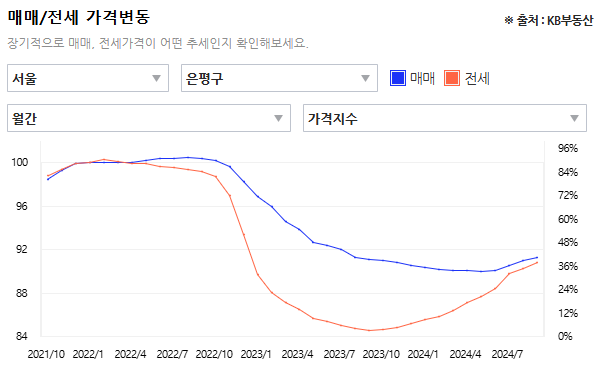 3분기 현재 은평구 전세지수는 23년 9월 이후 상승 / 매매지수는 24년 5월 이후 상승하는 모습입니다
