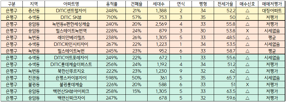 1. 은평구 30% 이내 아파트의 현재 전세가율과 저평가아파트를 확인하겠습니다