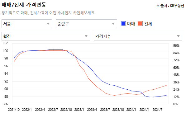 3분기 현재 중랑구 전세지수는 24년 2월 이후 상승 / 매매지수는 24년 7월 이후 상승하는 모습입니다