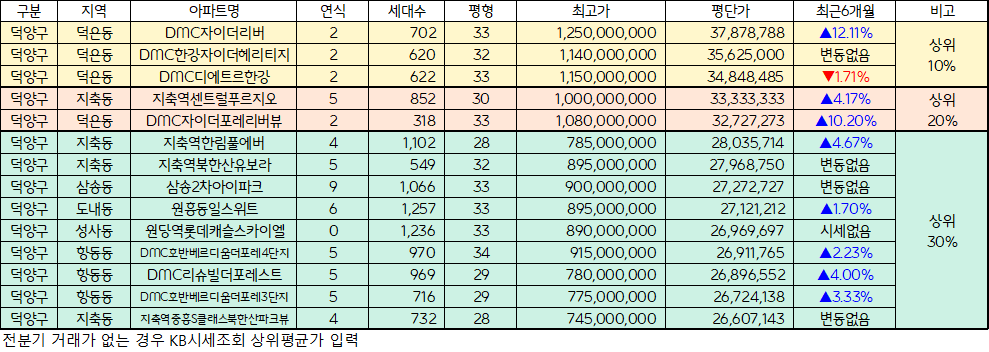 아파트실거래가(아실) 순위 분석에 따르면 아래 기준을 적용한 아파트 중 평단가가 가장 높은 DMC자이더리버를 기준으로 상위 30% 이내 아파트는 아래와 같습니다