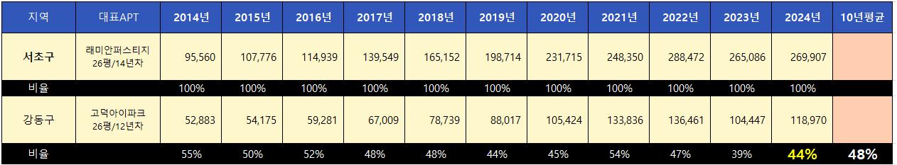 평단가가 가장 높은 서초구를 기준으로 강동구는 (10년) 평균 48%의 매매가율을 보여왔으나 현재는 44%의 수준으로 가격이 저평가된 상태라고 볼 수 있습니다