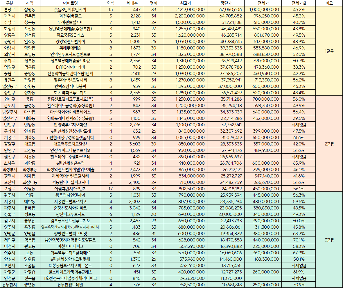 24년 4분기 경기 아파트 순위 및 전세가율
