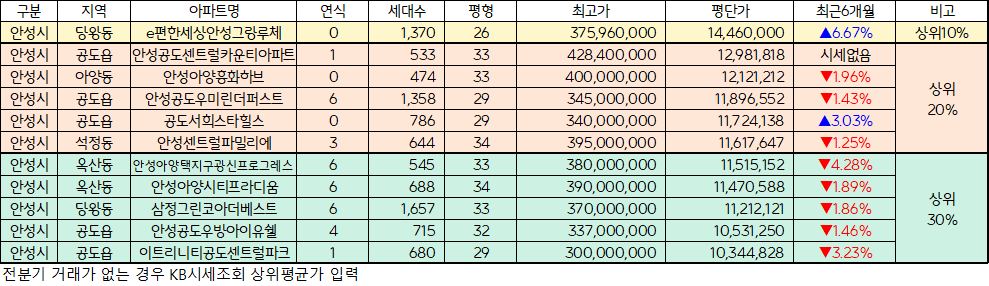 아파트실거래가(아실) 순위분석 툴을 활용하여 아래 기준을 적용한 아파트 중 평단가가 가장 높은 e편한세상안성그랑루체를 기준으로 상위 30% 이내 아파트는 아래와 같습니다