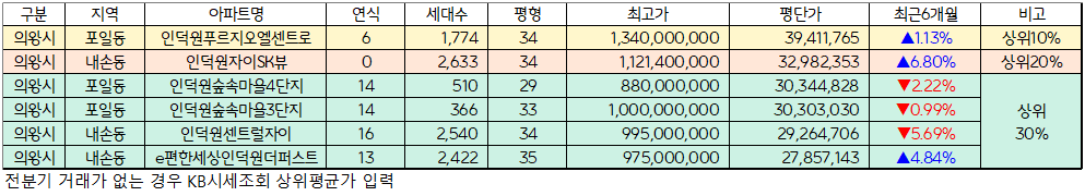 아파트실거래가(아실) 순위분석을 활용하여 아래 기준을 적용한 아파트 중 평단가가 가장 높은 인덕원푸르지오엘센트로를 기준으로 상위 30% 이내 아파트는 아래와 같습니다