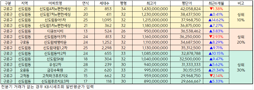 아래 기준을 적용한 아파트 중 평단가가 가장 높은 신도림4차e편한세상을 기준으로 상위 30% 아파트는 아래와 같습니다