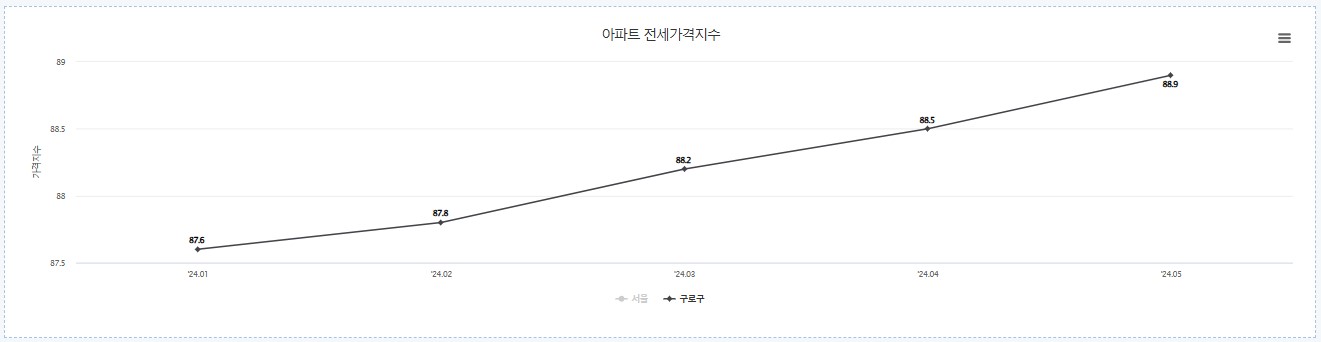 한국부동산원 자료에 따르면 24년 구로구 아파트 전세지수는 계속 상승하고 있습니다