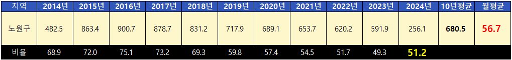 평단가가 높은 서초구를 기준으로 노원구는 (10년) 평균 46% 수준의 매매가율을 보였고 현재는 39% 수준으로 가격은 저평가된 상태라고 볼 수 있습니다