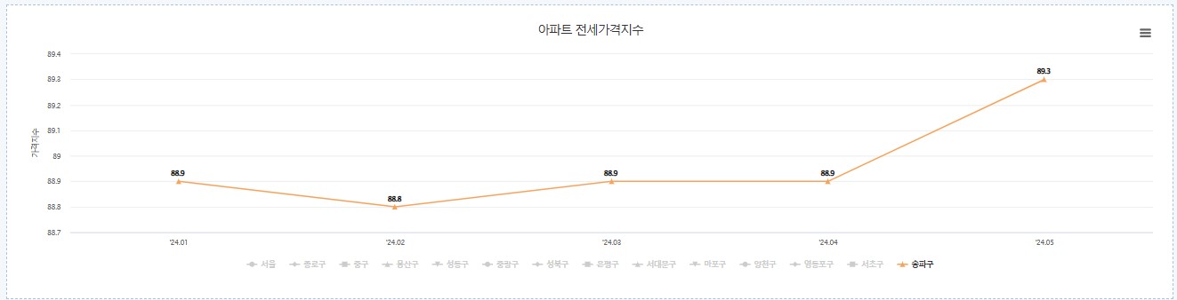 한국부동산원 자료에 따르면 24년 송파구 아파트 전세지수는 상승과 하락의 모습을 보여주다 5월 현재 크게 상승한 모습입니다