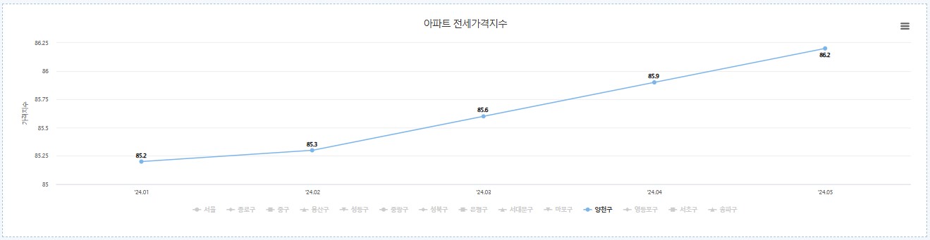 한국부동산원 자료에 따르면 24년 양천구 아파트 전세지수는 계속 상승하고 있습니다