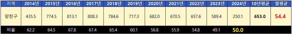 양천구의 10년 평균 전세가율은 54.4%이며 현재는 50%로 거품이 많은 것도 적은 것도 아닌 상태입니다