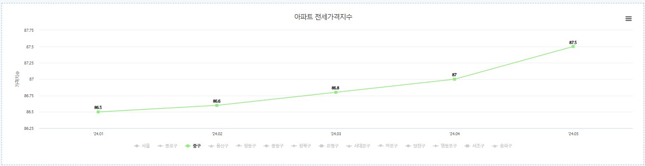 한국부동산원 데이터에 따르면 24년 중구 아파트 전세지수는 계속 상승하고 있습니다
