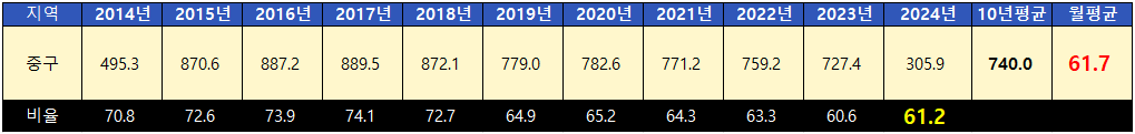 중구의 10년 평균 전세가율은 61.7%이며 현재는 61.2%로 거품이 많은 것도 적은 것도 아닌 상태입니다