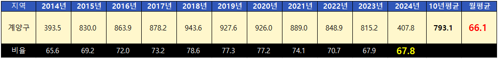 계양구의 10년 평균 전세가율은 66.1%였으며 현재는 67.8%로 거품이 많은 것도 적은 것도 아닌 상태입니다