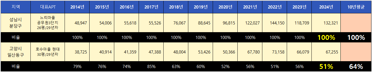 평단가가 가장 높은 성남시 분당구를 기준으로 일산동구는 10년 평균 64% 수준의 매매가율을 보였으나 현재는 51%로 가격이 저평가된 상태입니다