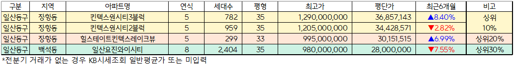 아래 기준을 적용한 아파트 중 평단가가 가장 높은 킨텍스윈시티3블럭을 기준으로 상위 30%의 아파트는 아래와 같습니다