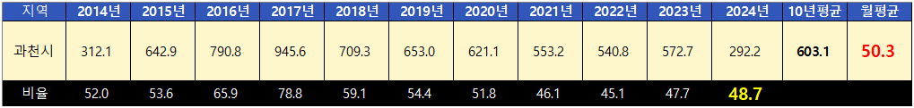 과천시의 10년 평균 전세가율은 50.3%이며 현재는 48.7%로 거품이 있는 것도 없는 것도 아닌 상태입니다