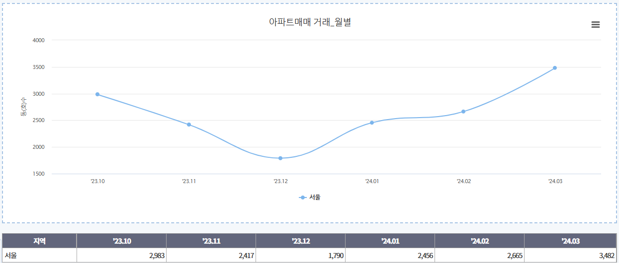 한국부동산원 정보에 따르면 23년 12월을 기점으로 서울지역 아파트 매매 거래량은 증가하고 있다는 걸 확인할 수 있습니다