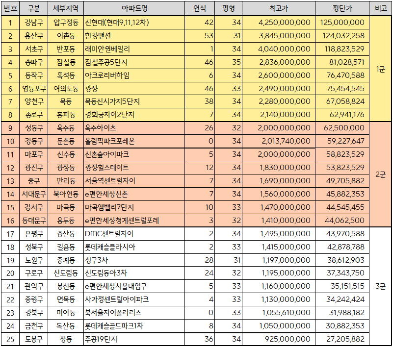 아파트실거래(아실)의 순위분석에 따르면 24년 1분기 서울의 대장지역과 대장아파트를 아래와 같이 볼 수 있습니다