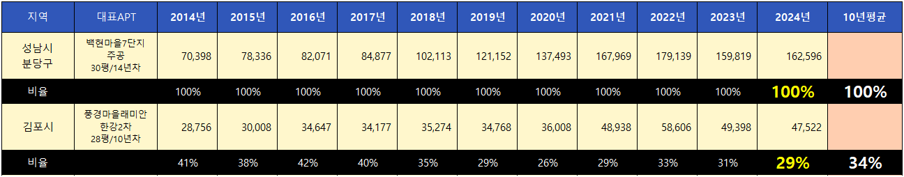 평단가가 가장 높은 성남시 분당구를 기준으로 김포시는 10년 평균 34% 수준의 매매가율을 보였고 현재는 29%로 가격은 약간 저평가된 상태입니다
