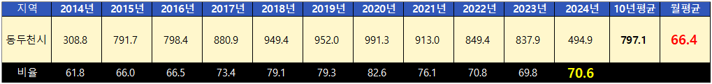 두천시 10년 평균 전세가율은 66.4%이며 현재는 70.6%로 거품이 있는 것도 없는 것도 아닌 상태입니다