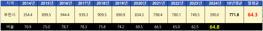 부천시 10년 평균 전세가율은 64.3%이며 현재는 64.8%로 거품이 있는 것도 없는 것도 아닌 상태입니다