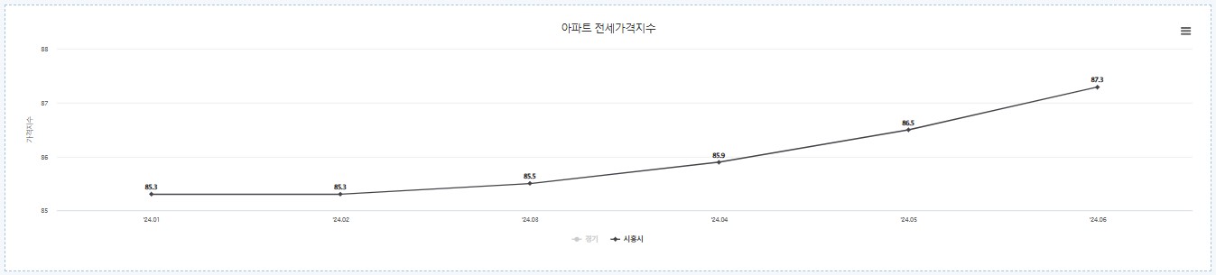 한국부동산원 데이터에 따르면 24년 시흥시 아파트 전세지수는 계속 상승하는 모습입니다