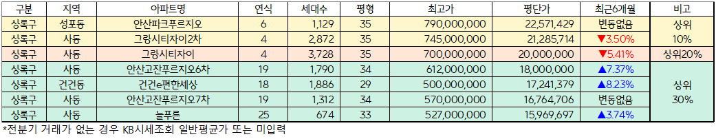 아파트실거래가(아실) 순위분석 툴을 활용하여 아래 기준을 적용한 아파트 중 평단가가 가장 높은 안산파크푸르지오를 기준으로 상위 30%의 아파트는 아래와 같습니다