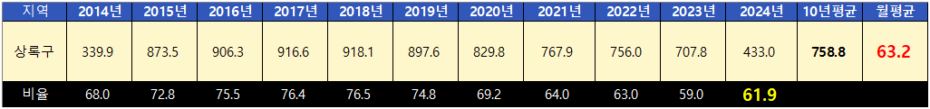 평단가가 가장 높은 성남시 분당구를 기준으로 상록구는 10년 평균 41% 수준의 매매가율을 보였고 현재는 30%로 매매가격은 저평가된 상태입니다