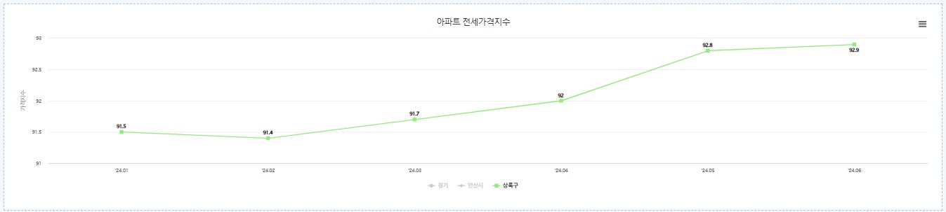한국부동산원 데이터에 따르면 24년 상록구 아파트 전세지수는 24년 2월 이후 계속 상승 중입니다