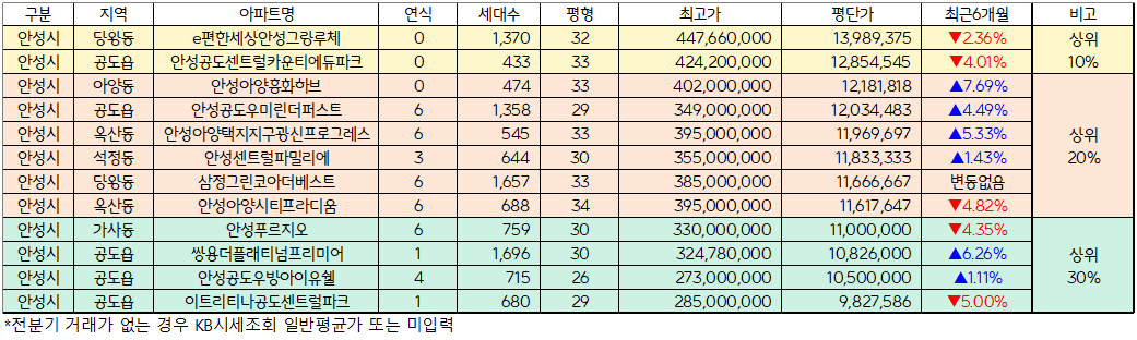 아파트실거래가(아실)의 순위분석 툴을 활용하여 아래 기준을 적용한 아파트 중 평단가가 가장 높은 e편한세상안성그랑루체를 기준으로 상위 30%의 아파트는 아래와 같습니다