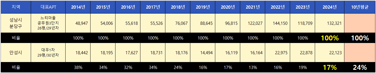 평단가가 가장 높은 성남시 분당구를 기준으로 안성시는 10년 평균 24%의 매매가율을 보였고 현재는 17%로 매매가격은 약간 저평가된 상태입니다