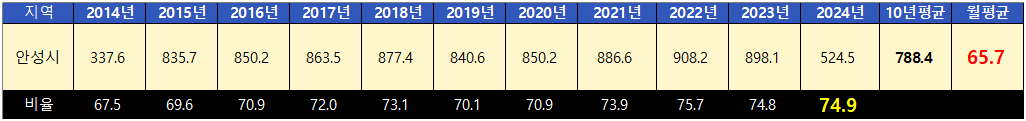 안성시 10년 평균 전세가율은 65.7%이며 현재는 74.9%로 거품수치가 낮은 상태로 보입니다
