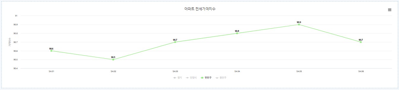 한국부동산원 데이터에 따르면 24년 만안구 아파트 전세지수는 5월 이후 하락하는 모습입니다
