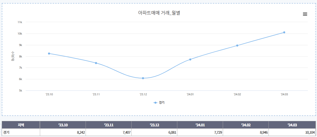한국 부동산원 월별 아파트 매매 거래량 그래프를 보면 경기는 23년 12월 기준 아파트 매매 거래량이 증가하고 있다는 것을 확인할 수 있습니다