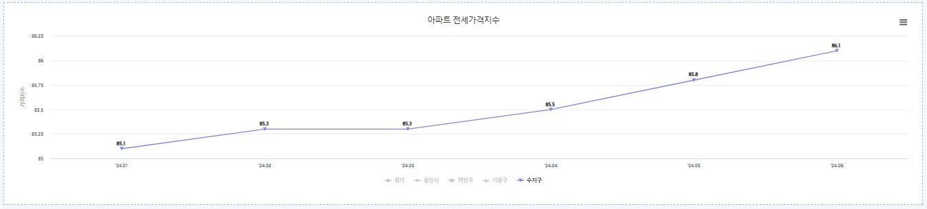 한국부동산원 데이터에 따르면 24년 용인시 수지구 아파트 전세지수는 계속 상승 중입니다