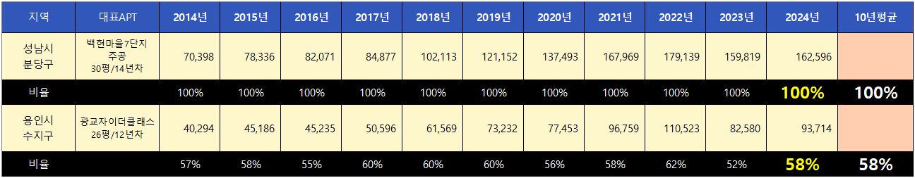 평단가가 가장 높은 성남시 분당구를 기준으로 수지구는 10년 평균 58%의 매매가율을 보였으며 현재는 58%로 매매가격은 평균 수준을 유지하는 것으로 보입니다