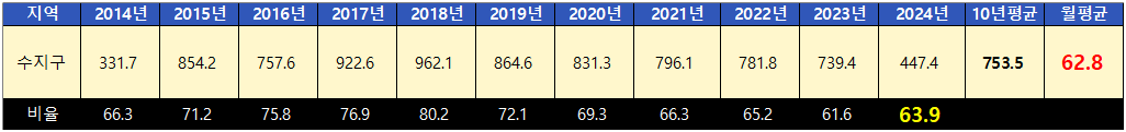 수지구는 10년 평균 전세가율은 62.8%이며 현재는 63.9%로 거품이 있는 것도 없는 것도 아닌 상태입니다