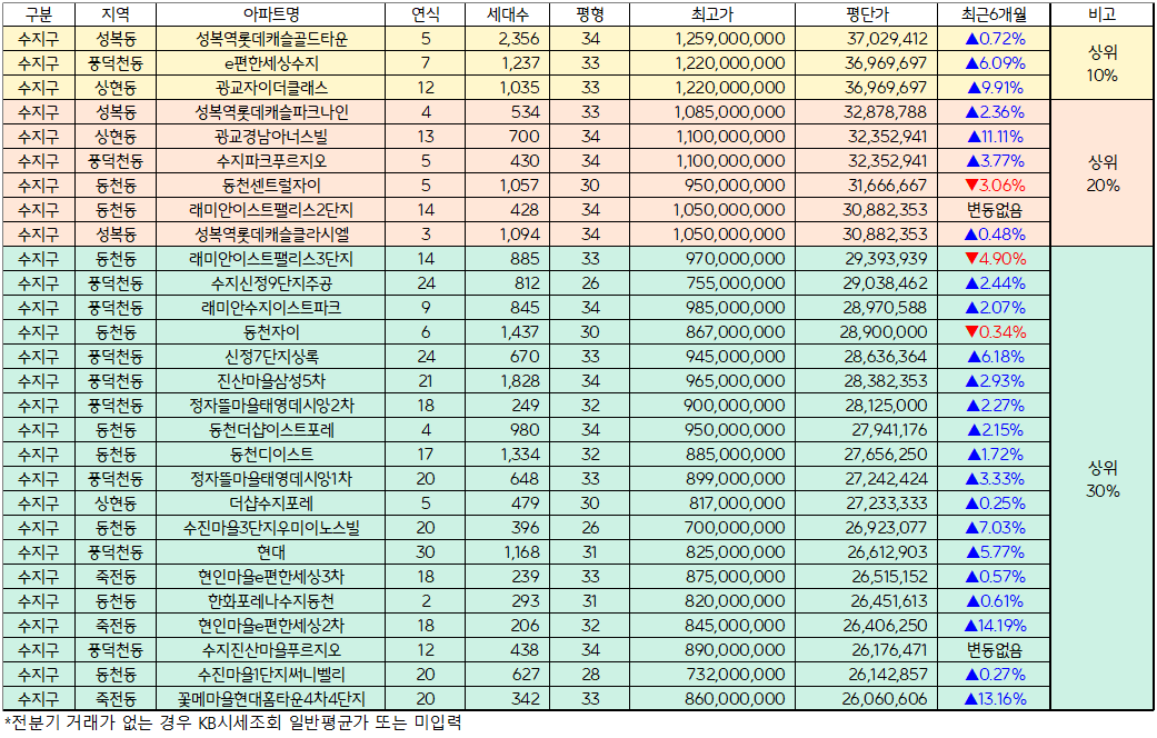 아파트실거래가(아실)의 순위분석 툴을 활용하여 아래 기준을 적용한 아파트 중 평단가가 가장 높은 성복역롯데캐슬골드타운을 기준으로 상위 30%의 아파트는 아래와 같습니다