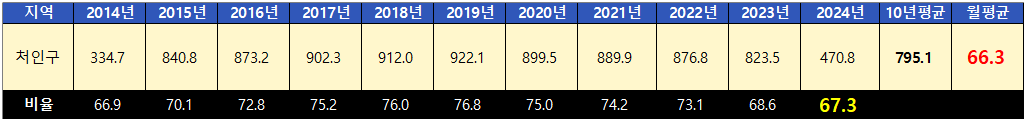 한국부동산원 데이터에 따르면 24년 용인시 처인구 아파트 전세지수는 4월 이후 하락 중입니다