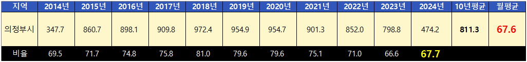 의정부시의 10년 평균 전세가율은 67.6%이며 현재는 67.7%로 거품이 있는 것도 없는 것도 아닌 상태입니다
