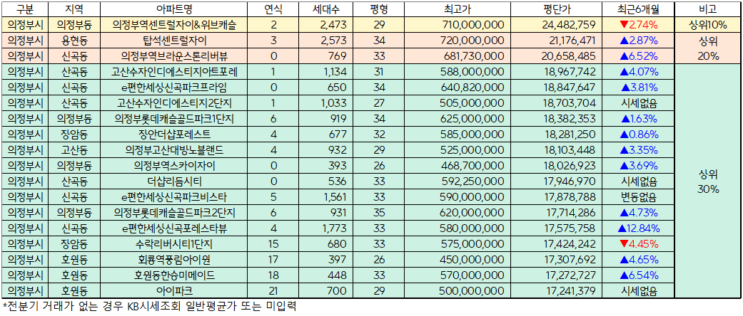 아파트실거래가(아실)의 순위분석 툴을 활용하여 아래 기준을 적용한 아파트 중 평단가가 가장 높은 의정부역센트럴자이&위브캐슬를 기준으로 상위 30% 아파트는 아래와 같습니다