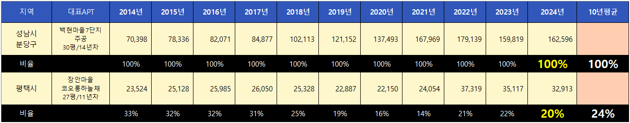 평단가가 가장 높은 성남시 분당구를 기준으로 평택시는 10년 평균 24%의 매매가율을 보였으며 현재는 20%로 매매가격은 저평가된 상태입니다