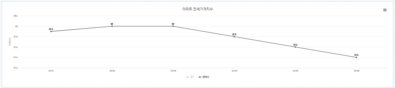 한국부동산원 데이터에 따르면 24년 평택시 아파트 전세지수는 3월 이후 계속 하락 중입니다