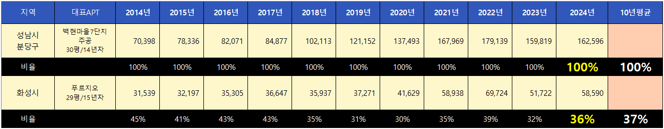 평단가가 가장 높은 성남시 분당구를 기준으로 화성시는 10년 평균 37%의 매매가율을 보였으며 현재는 36%로 매매가격은 약간 저평가된 상태입니다
